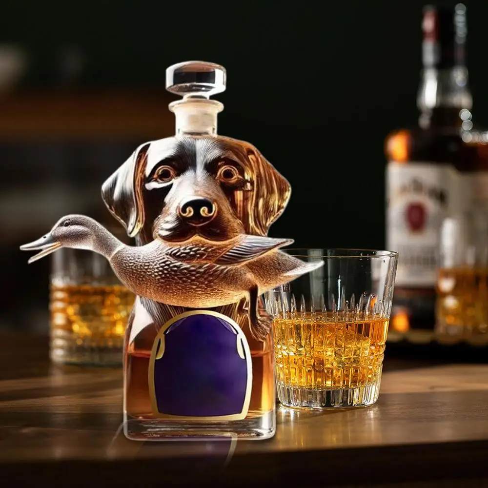 1.Intricate Glass Artisanship: Impress guests using the hound-shaped whiskey decanter, crafted as a home decor accent piece, combining functionality and art in a 3D engraved detail glass bottle for refined whiskey storage, decorative bottle presentation